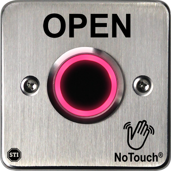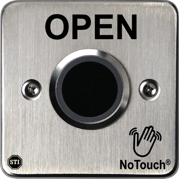 NoTouch® Stainless Steel Button offers three standard models: OPEN, EXIT and the international exit symbol representing a person exiting. Custom models are also available with printing capabilities at STI’s corporate and international offices.