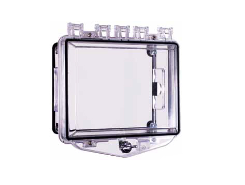 Multipurpose lockable enclosure for a wide range of larger size devices, components and instruments, such as keypads, annunciators and automated external defibrillators (AEDs) which require protection from vandalism, accidental damage, as well as the elements, such as dirt and grime. Spacers, integrated hinge and covers are formed from tough polycarbonate material. The polycarbonate enclosures are backed by a three year guarantee against breakage and damage in normal use. STI enclosure is lockable with either a thumb lock.