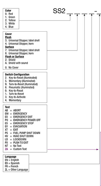 N/A 0 - Key-to-Reset 1 - Turn-to-Reset 2 - Key-to-Reset (Illuminated) 3 - Key-to-Activate 4 - Momentary 5 - Momentary (Illuminated) 8 - Pneumatic (Illuminated) 9 - Turn-to-Reset (Illuminated) |