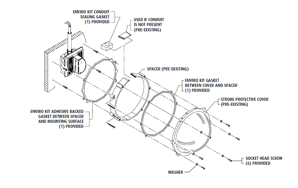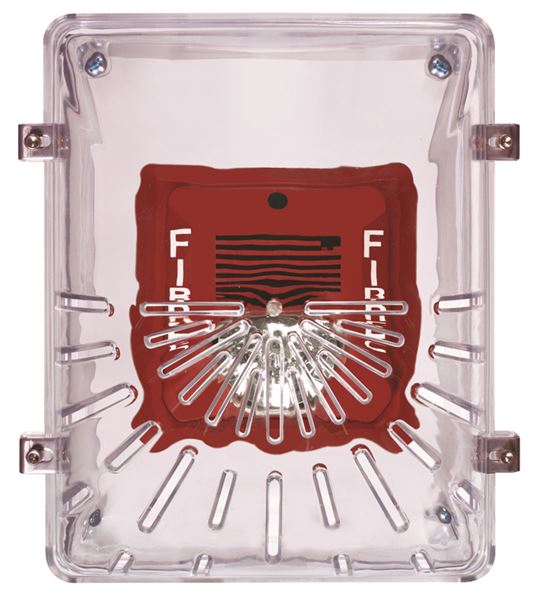These virtually indestructible covers (slotted for horn or speaker units and solid for strobe-only alarms) are designed to stop vandalism and accidental damage. Molded of clear, thick, UV-stabilized polycarbonate material, they are backed by a three year guarantee against breakage in normal use. Slots in the STI-1210 allow the horn to be heard. For the STI-1210 series, spacer A has a four inch deep enclosed backbox, spacer B has an enclosed backbox molded with an integral double-gang outlet box. Spacer C has an open back for retrofit applications. Spacer D accommodates deeper units and applications with exposed conduit electrical connections. Spacer E has an open back frame for flush-mount applications. An appliance mounting plate comes with the STI-1219/1229. Unique Enviro Kits are available for extreme conditions where dampness or water is present.